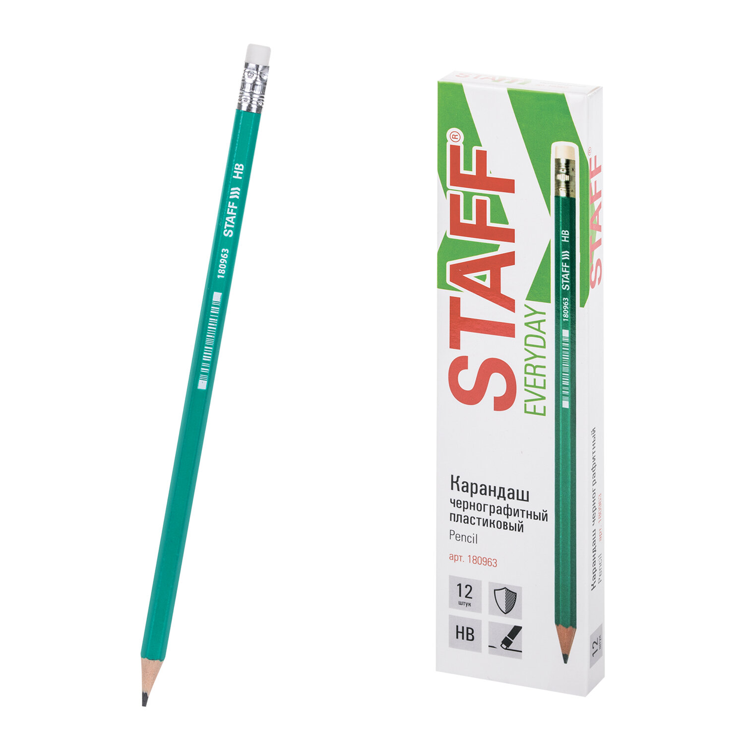 Карандаш чернографитный STAFF EVERYDAY BLP-963, 1шт., НВ, с ластиком, пластиковый, зел.корпус,180963