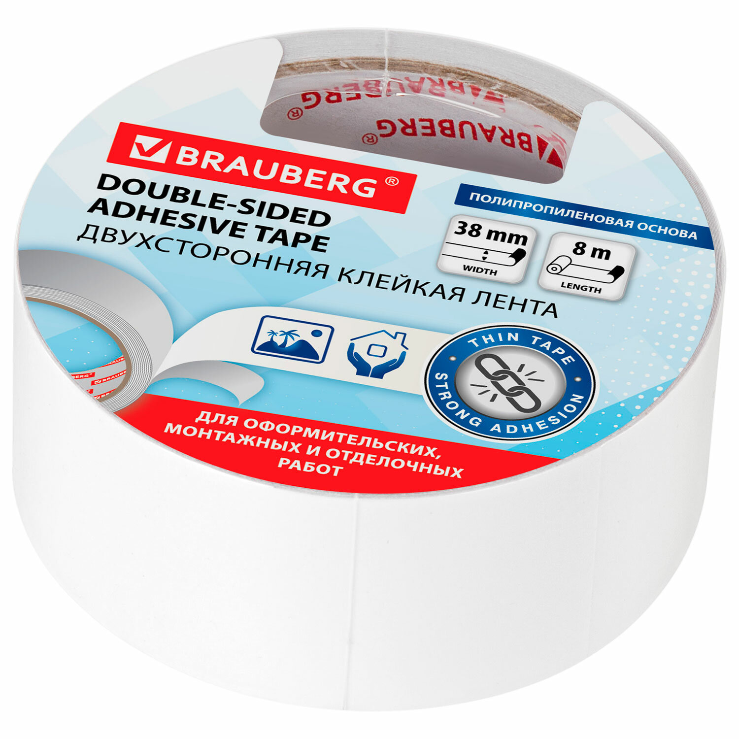 Клейкая двухсторонняя лента 38мм х 8м, ПОЛИПРОПИЛЕНОВАЯ ОСНОВА, 90 микрон, BRAUBERG, 600483