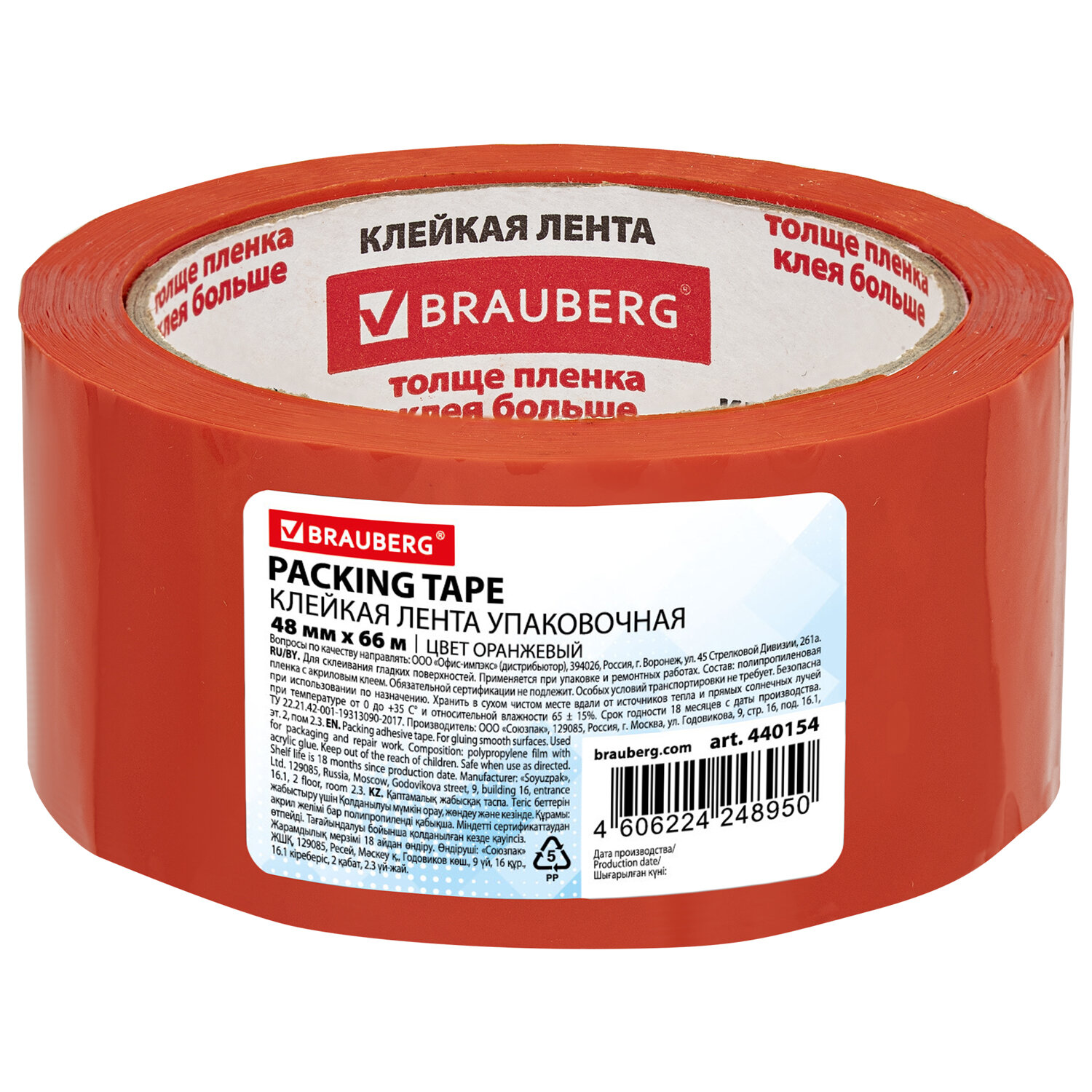 Клейкая лента упаковочная, 48 мм х 66 м, ОРАНЖЕВАЯ, толщина 45 микрон, BRAUBERG, 440154