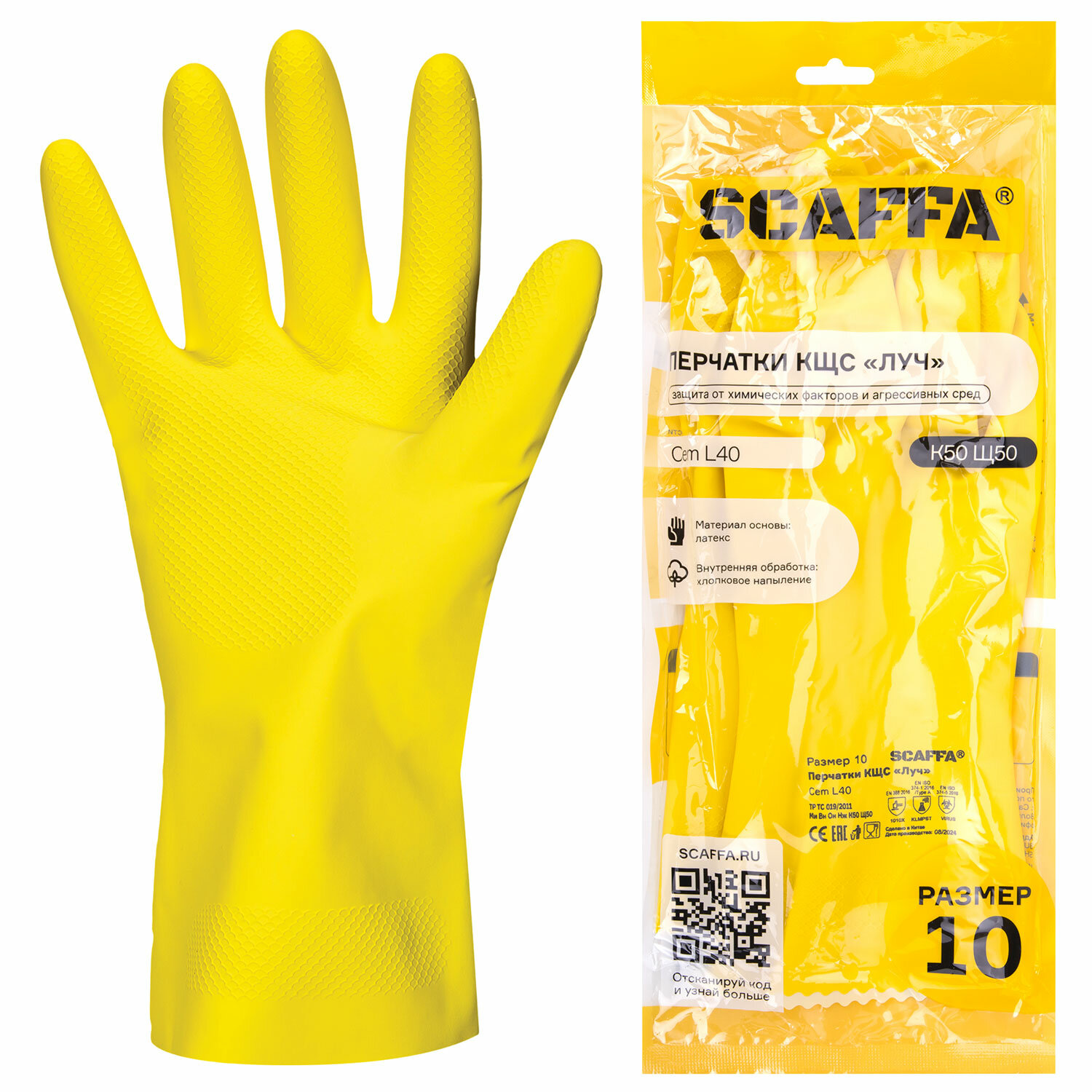 Перчатки латексные SCAFFA Луч, КЩС-2, хлопчатобумажное напыление, р. 10, XL, желтые, шк 8066