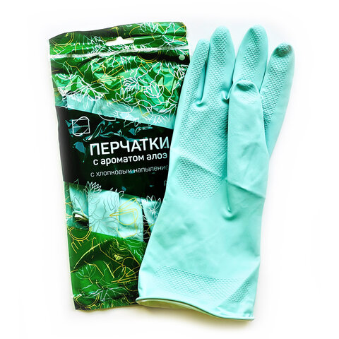 Перчатки МНОГОРАЗОВЫЕ латексные с ароматом АЛОЭ зеленые, х/б напыление, размер 8-9, L, 609365